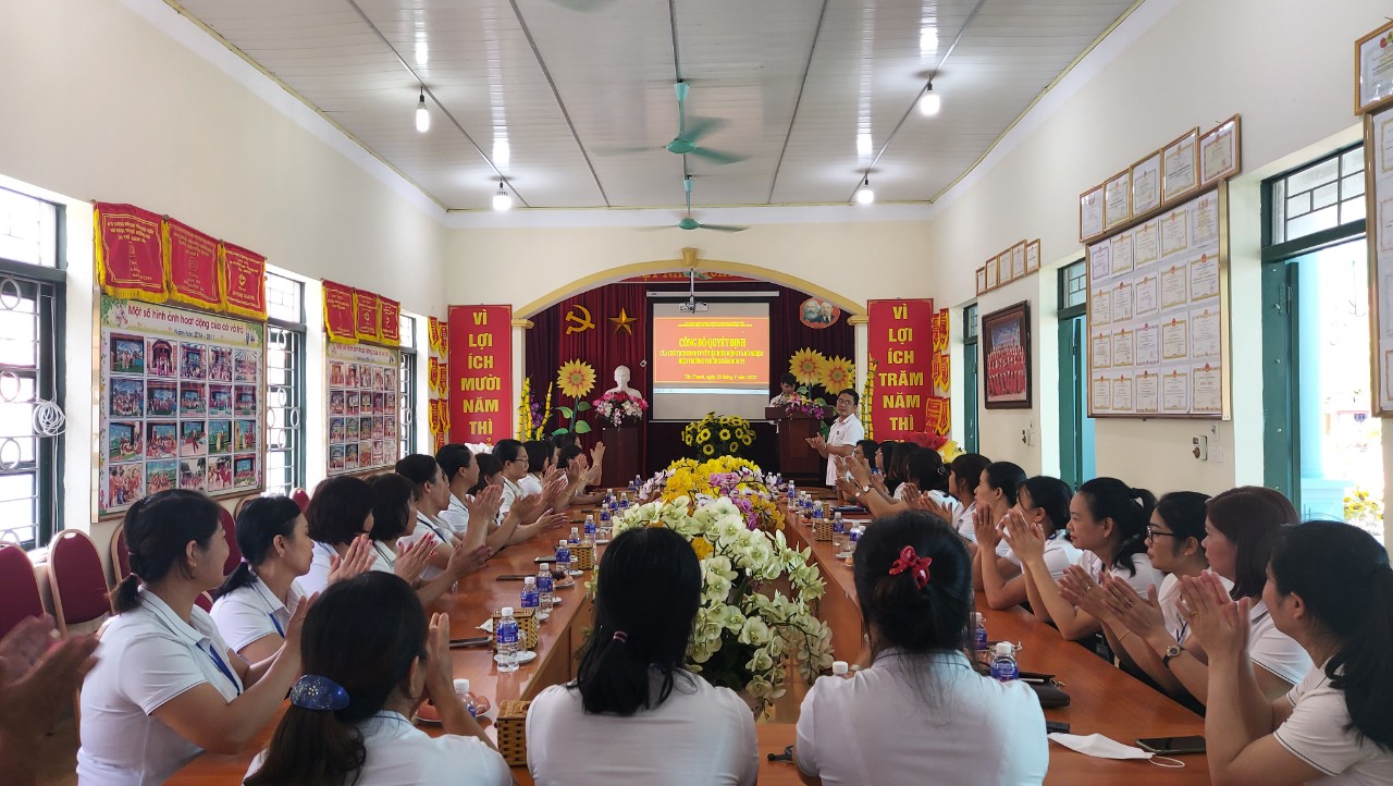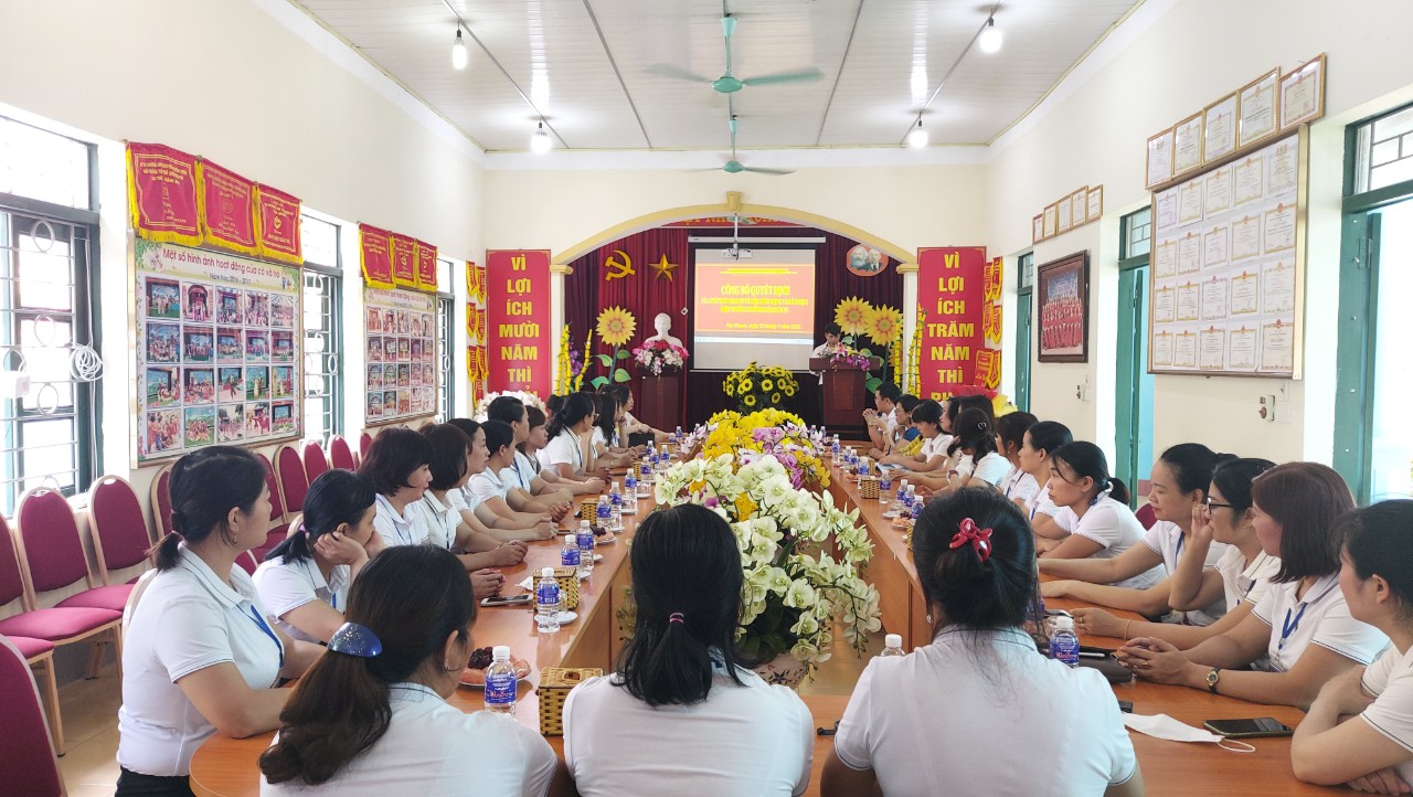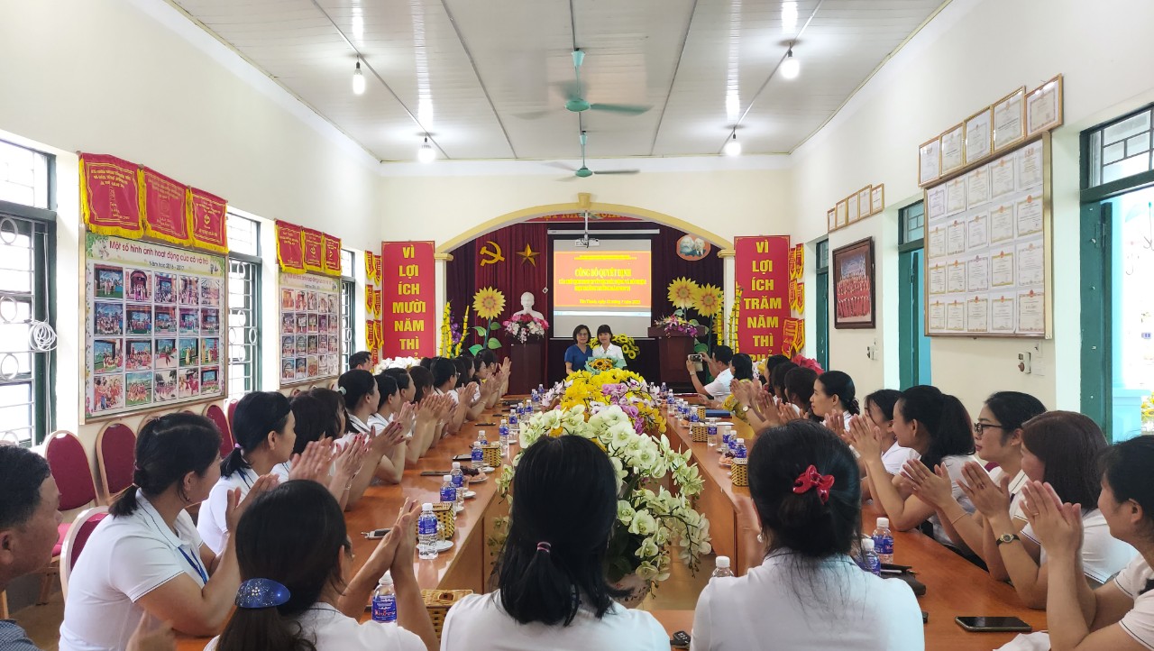 Đồng chí Bùi Thị Hiền Phó Bí thư Chi bộ - Phó Trưởng Phòng GD & ĐT trao quyết định, tặng hoa chúc mừng và phát biểu giao nhiệm vụ cho đồng chí Nguyễn Thị Phúc tân Hiệu trưởng trường mầm non 7/5 tiếp tục phát huy vai trò trách nhiệm và nâng cao năng lực quản lý của mình để lãnh đạo tập thể nhà trường vững bước đi lên. Bên cạnh đó tập thể cán bộ giáo viên nhà trường tiếp tục phát huy trí tuệ tập thể, cán bộ công chức, viên chức và người lao động tạo điều kiện, giúp đỡ đồng chí Nguyễn Thị Phúc trên cương vị công tác mới hoàn thành tốt nhiệm vụ được các cấptrên giao, góp phần xây dựng trường mầm non 7/5 vững mạnh xứng đáng là cánh chim đầu đàn của cấp học mầm non Thành phố.