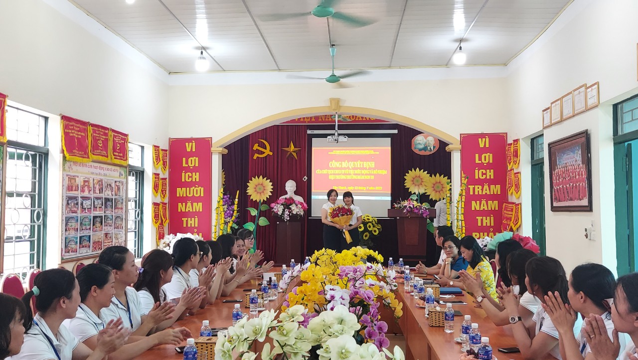 Đồng chí Bùi Thị Hiền Phó Bí thư Chi bộ - Phó Trưởng Phòng GD & ĐT trao quyết định, tặng hoa chúc mừng và phát biểu giao nhiệm vụ cho đồng chí Nguyễn Thị Phúc