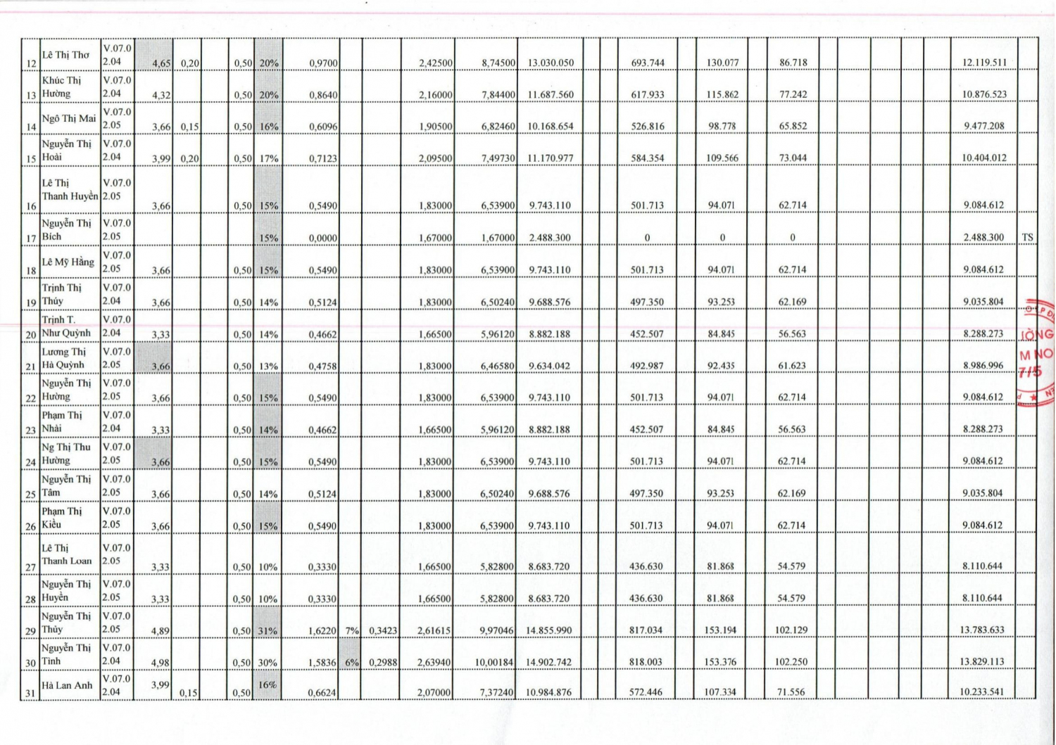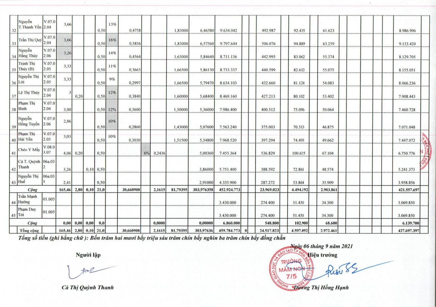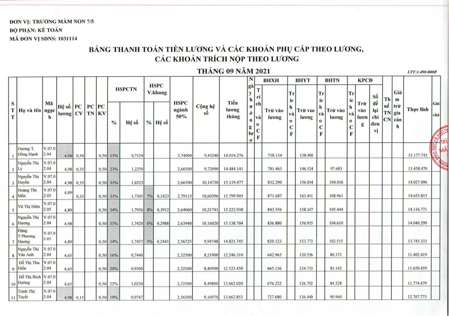 TRƯỜNG MẦM NON 7/5 CÔNG KHAI CHẾ ĐỘ LƯƠNG THÁNG 9 -2021