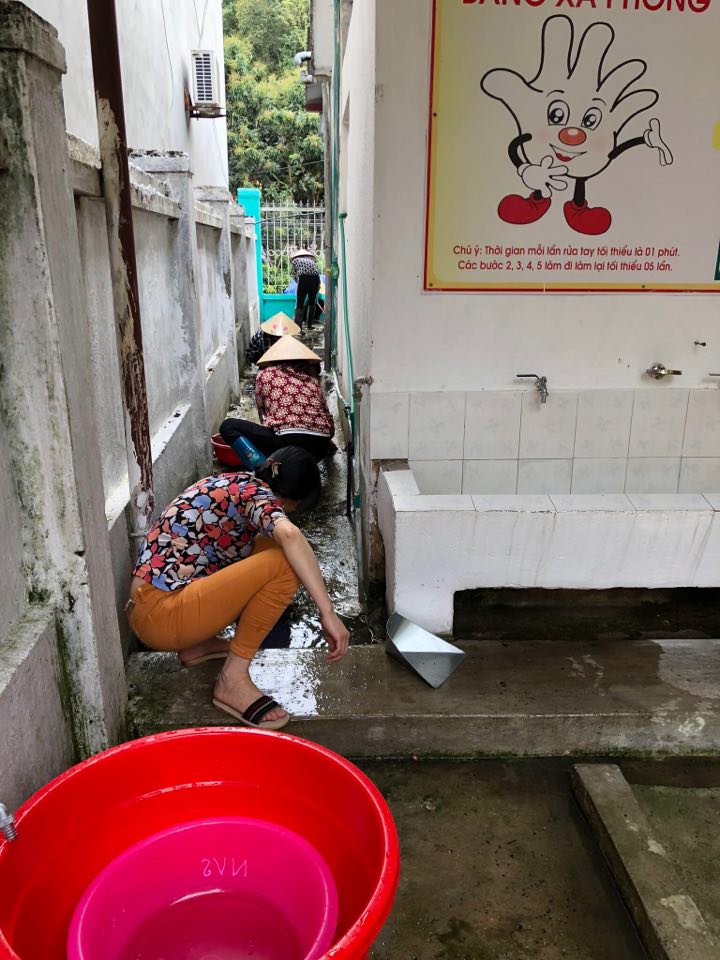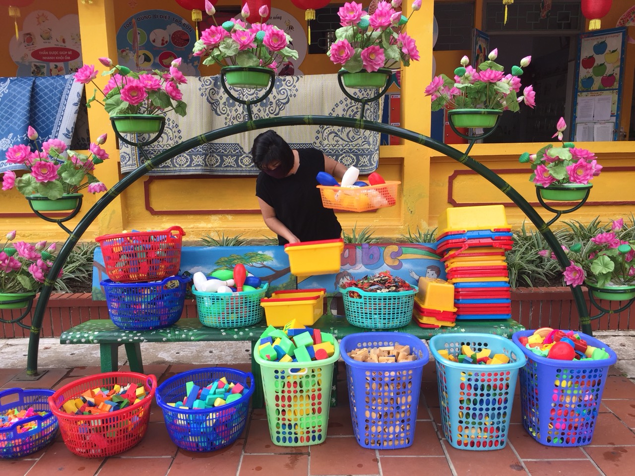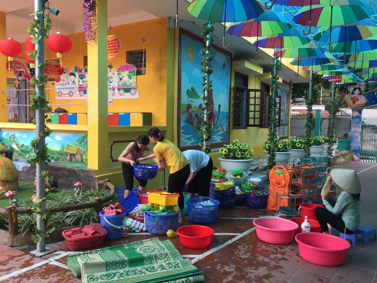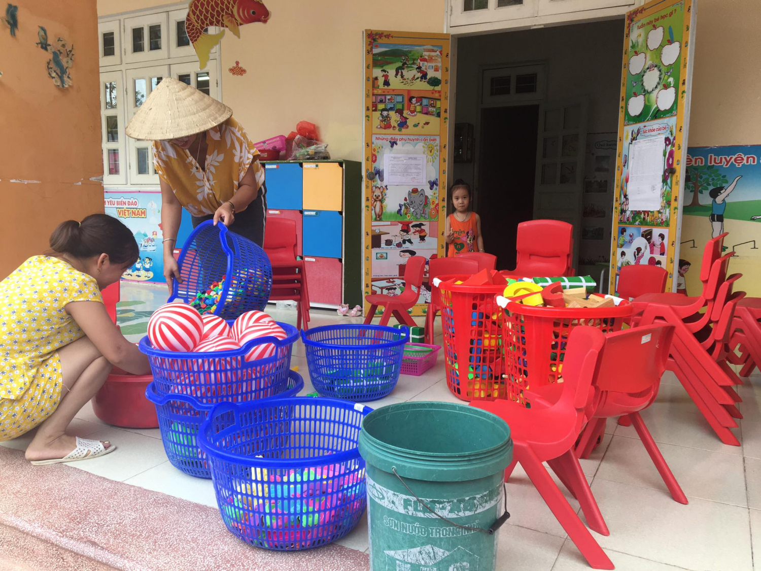Nhà trường thực hiện cài đặt các ứng dụng phòng chống dịch bệnh COVID-19, chú trọng công tác vệ sinh môi trường, phun thuốc khử khuẩn phòng chống dịch bệnh, trang trí và tạo cảnh quan thông thoáng cho lớp học; định kỳ hàng tháng phát quan cây cỏ, khơi thông cống rãnh, hàng tuần các lớp tiến hành vệ sinh, khử khuẩn, tẩy rửa đồ dùng đồ chơi cho trẻ.