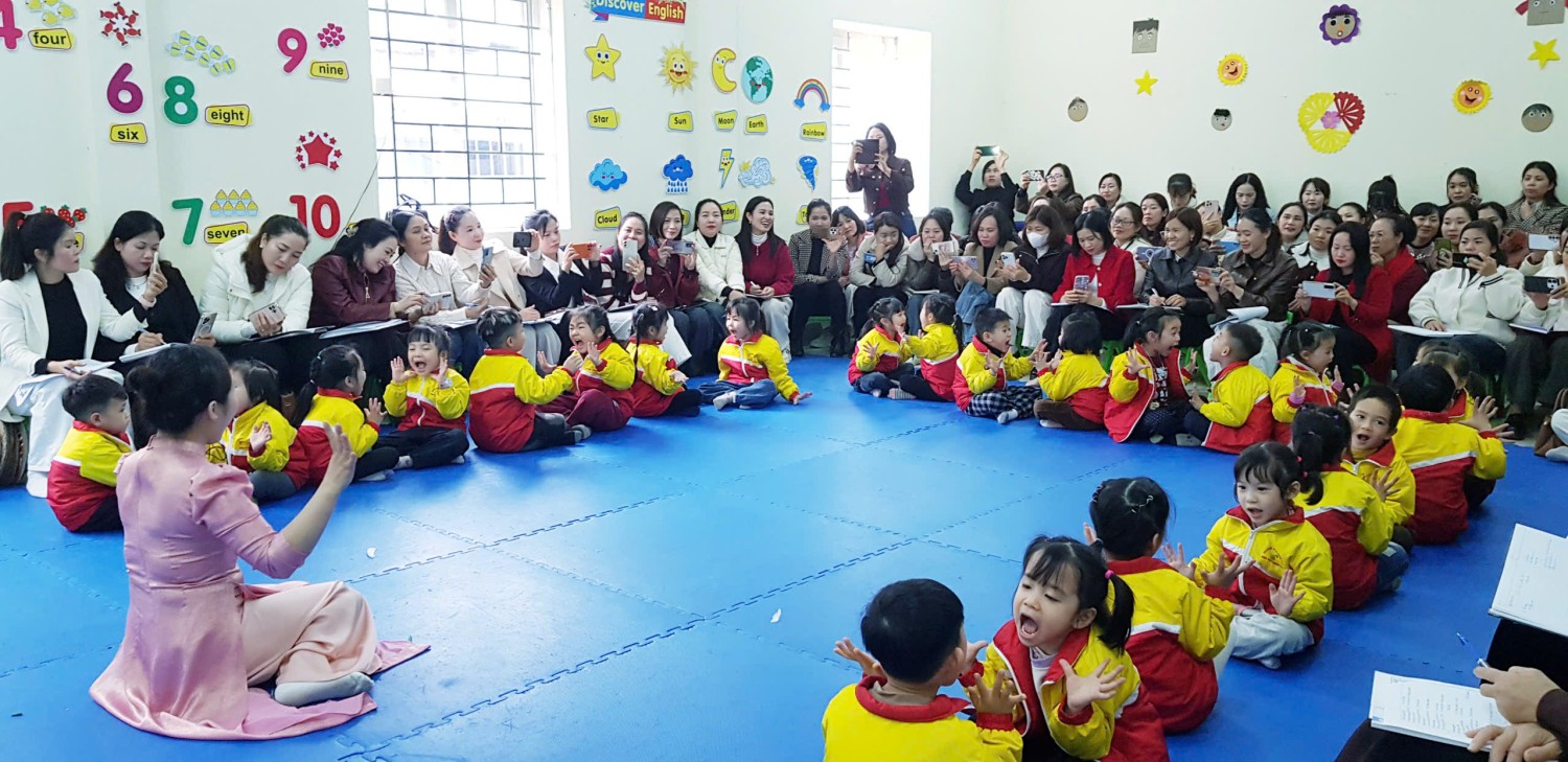 Ngay từ những phút đầu đón tiếp, các đại biểu đã có dịp tham quan môi trường giáo dục trong và ngoài lớp học tại Trường Mầm non 7/5. Với tư duy đổi mới, nhà trường đã sáng tạo, tạo nên một không gian học tập an toàn, thân thiện và kích thích sự sáng tạo của trẻ. Bầu không khí trở nên sôi động và đầy năng lượng với hoạt động thể dục sáng của các cô giáo, các cháu học sinh và các tiết mục văn nghệ chào mừng do các cô giáo cùng các em sinh viên thực tập biểu diễn. Tiếp theo các đại biểu được dự giờ 02 hoạt động tại trường: Hoạt động Giáo dục cảm xúc với đề tài “Muôn màu cảm xúc” - giáo viên dạy minh họa Đàm Thị Hạnh - Phạm Thị Hải Yến (Trẻ mẫu giáo 4-5 tuổi); Hoạt động trải nghiệm với đề tài “Làm cơm trộn, kimpab, cơm nắm muối vừng” - giáo viên dạy minh hoạ Nguyễn Thị Lời - Lê Thị Thơ (Trẻ mẫu giáo 5-6 tuổi).