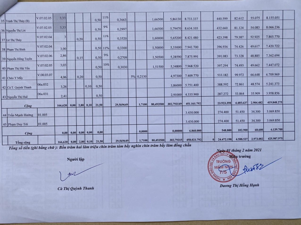 TRƯỜNG MẦM NON 7/5 THỰC HIỆN CÔNG KHAI CHẾ ĐỘ LƯƠNG THÁNG 02 – 2021