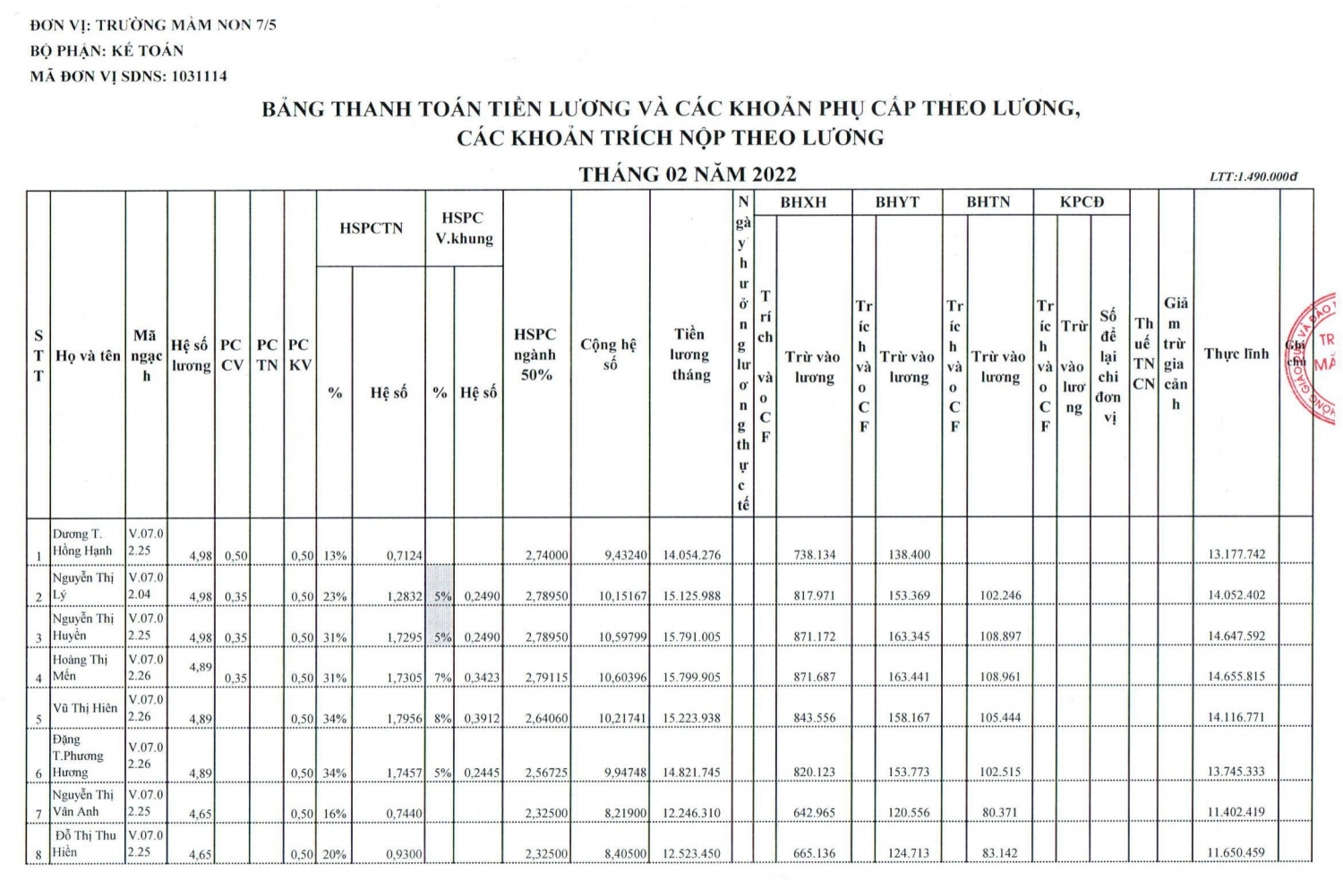 TRƯỜNG MN 7/5 THỰC HIỆN CÔNG KHAI CHẾ ĐỘ LƯƠNG THÁNG 02/2022