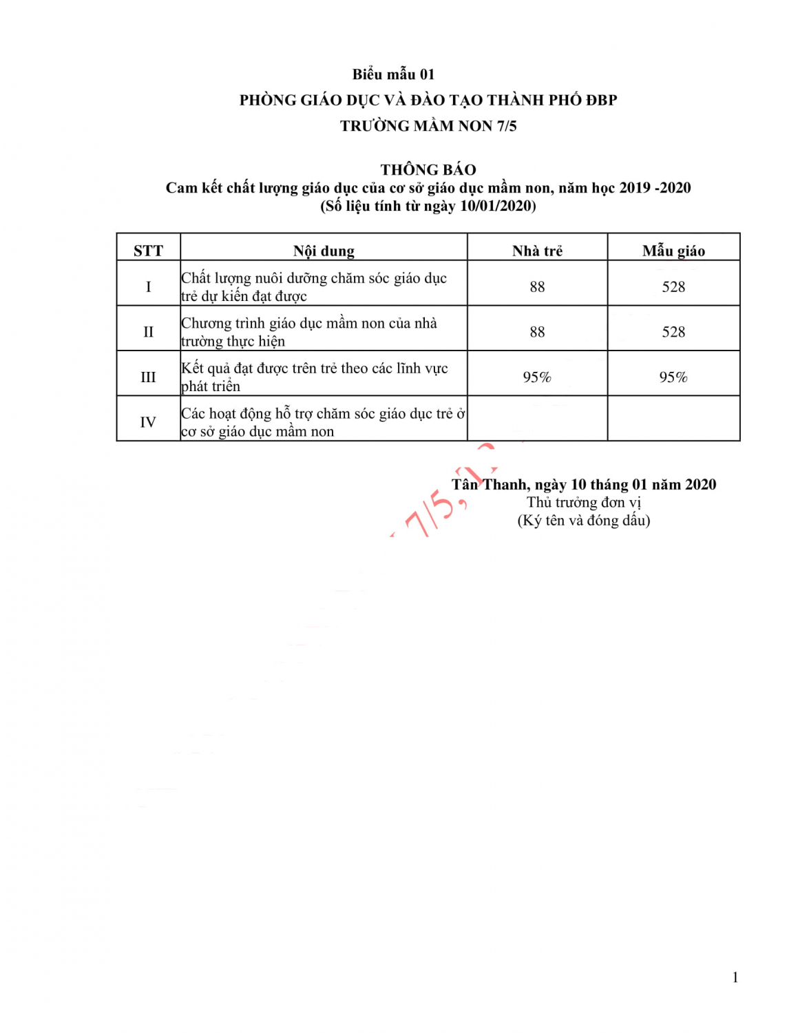 Cam kết chất lượng giáo dục của cơ sở giáo dục mầm non, năm học 2019 -2020