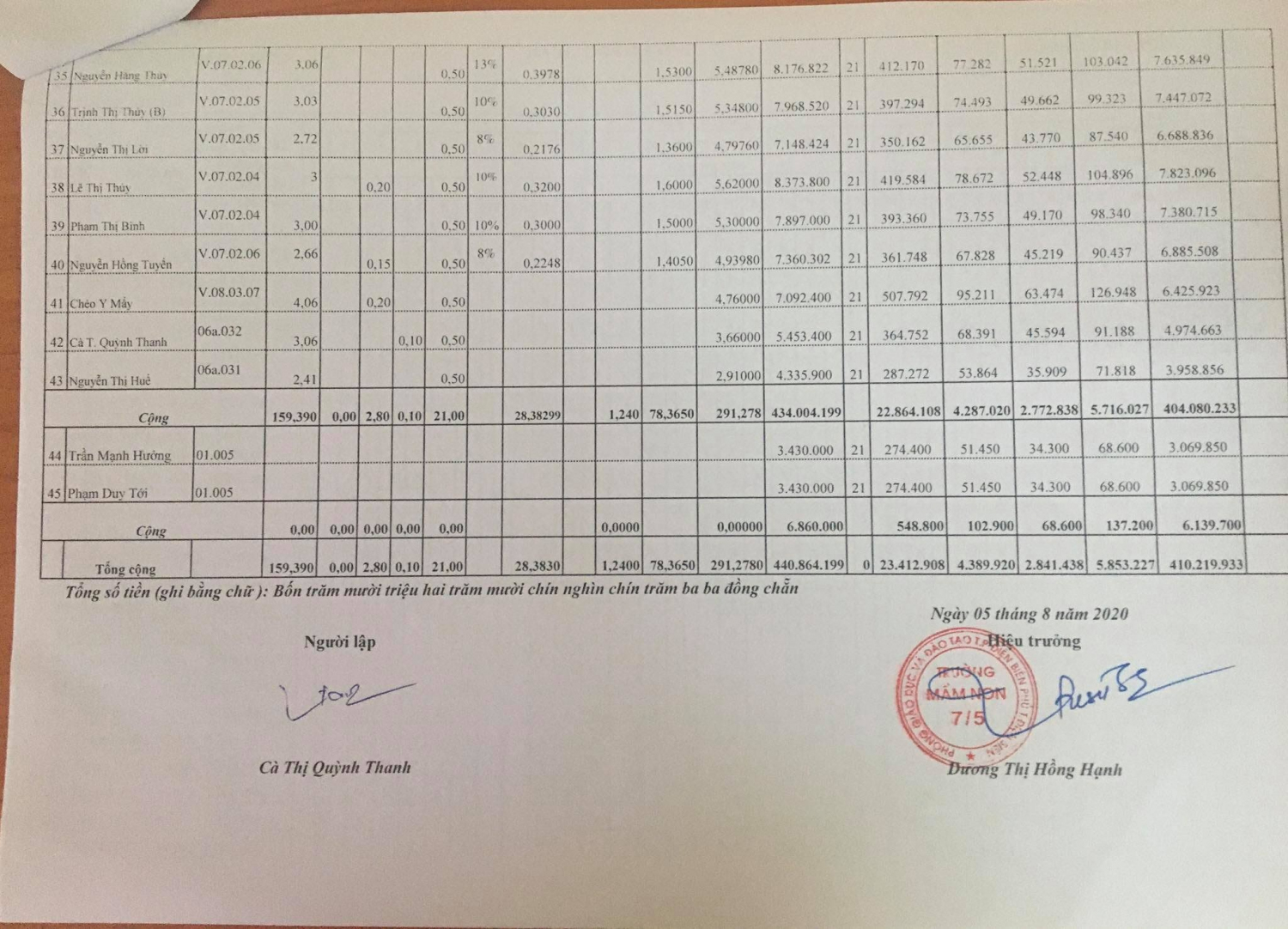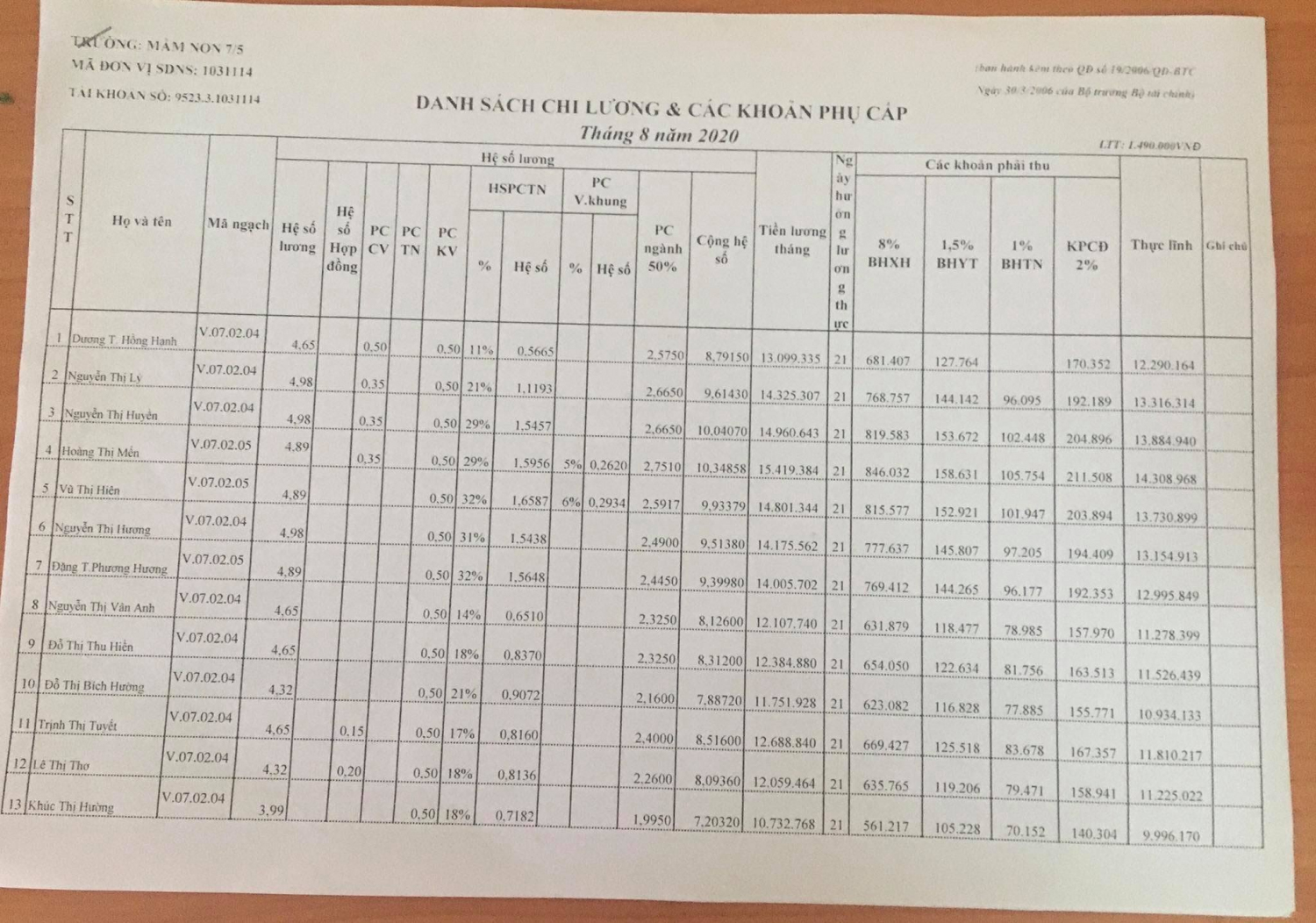 TRƯỜNG MẦM NON 7/5 THỰC HIỆN CÔNG KHAI CHẾ ĐỘ LƯƠNG THÁNG 8-2020