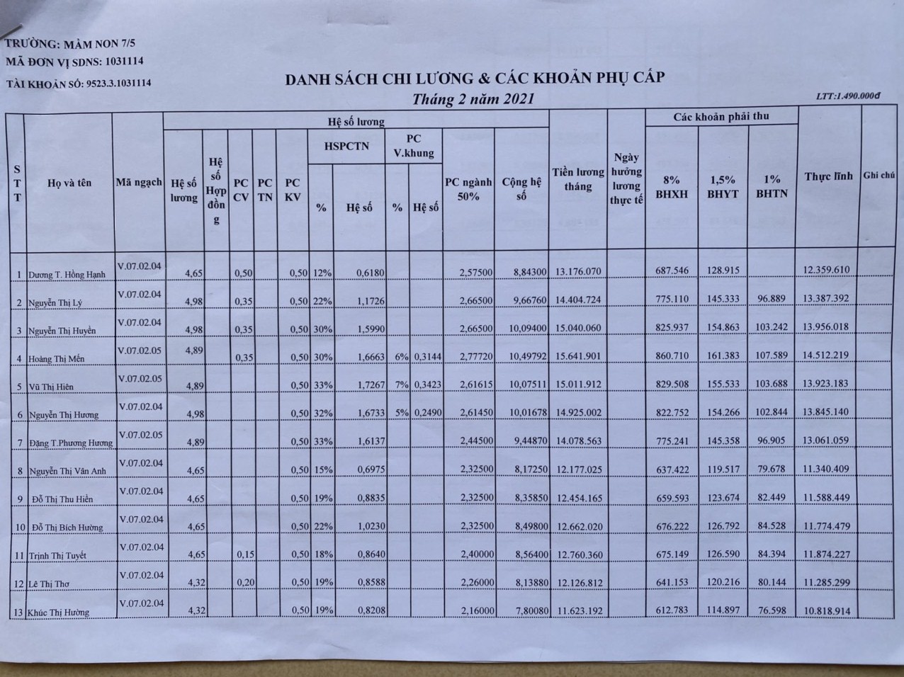 TRƯỜNG MẦM NON 7/5 THỰC HIỆN CÔNG KHAI CHẾ ĐỘ LƯƠNG THÁNG 02 – 2021