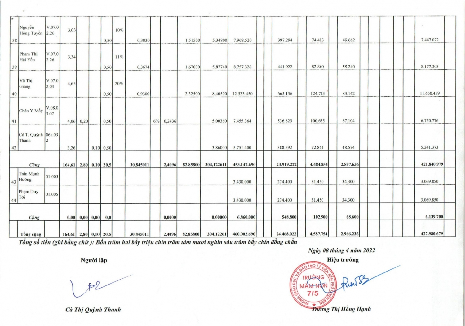 TRƯỜNG MN 7/5 THỰC HIỆN CÔNG KHAI CHẾ ĐỘ LƯƠNG THÁNG 04/2022